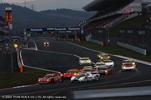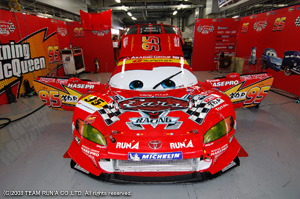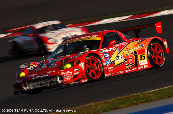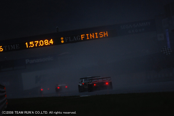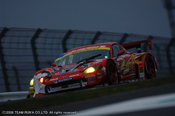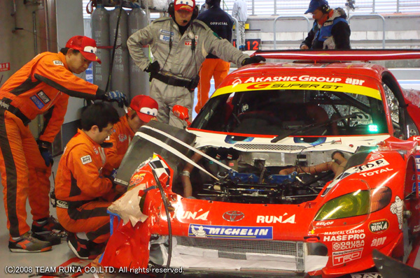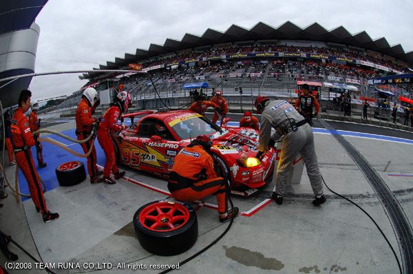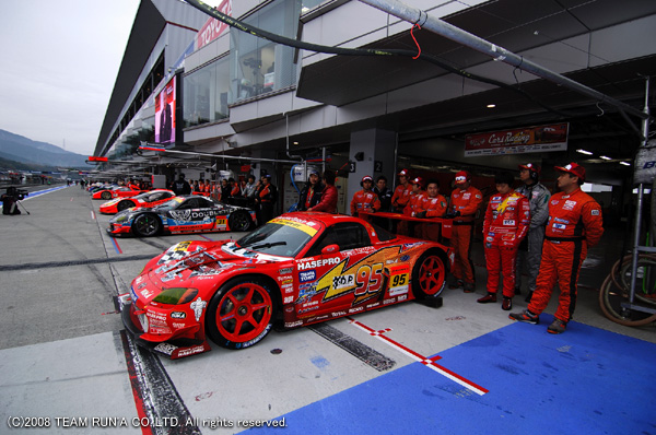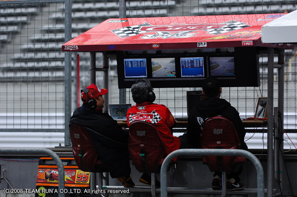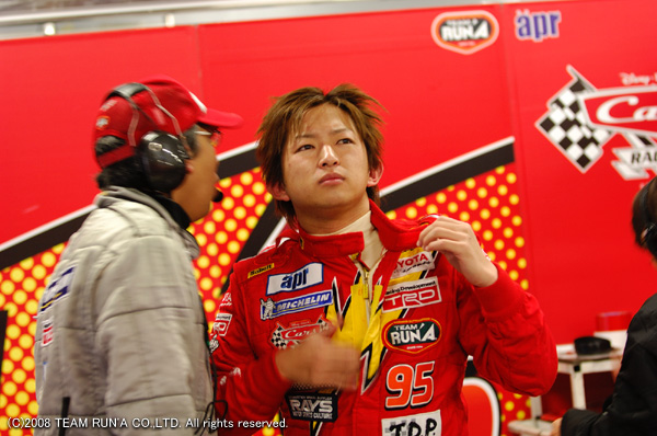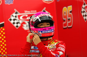 予選1回目は10時10分から開始された。早朝から降り続いている雨は止むことはなく、路面は完全なウエット状態。 「95号車 ライトニング マックィーン apr MR-S」は、平手選手がステアリングを握りコースイン。 予想以上の雨の量にタイヤ選択をチームが誤り苦戦。なかなかスーパーラップ圏内のタイムには届かなかったが、300クラスの専有時間終了直前、1分59秒680をマークし10番手に滑り込む。